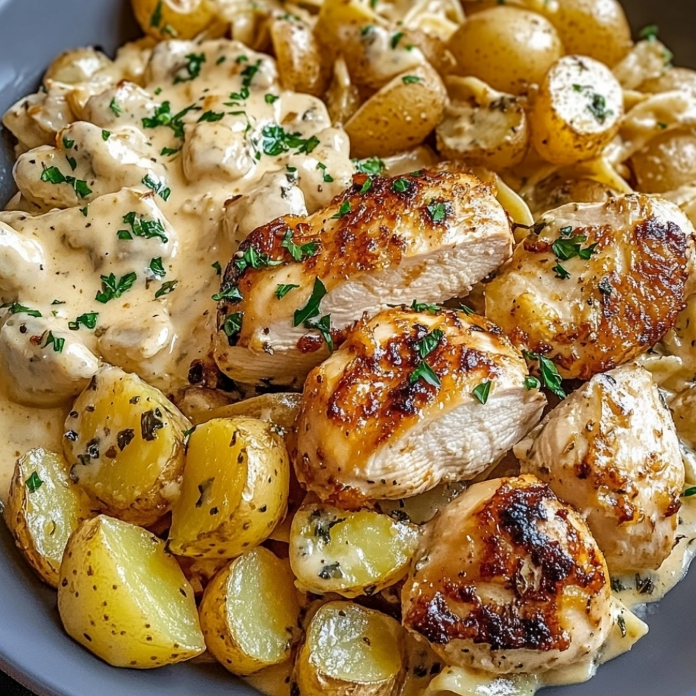 A cozy, one-pan-style dinner featuring juicy chicken, crispy roasted potatoes, and tender pasta tossed in a rich garlic-Parmesan cream sauce. Comforting, filling, and perfect for family meals or guests.