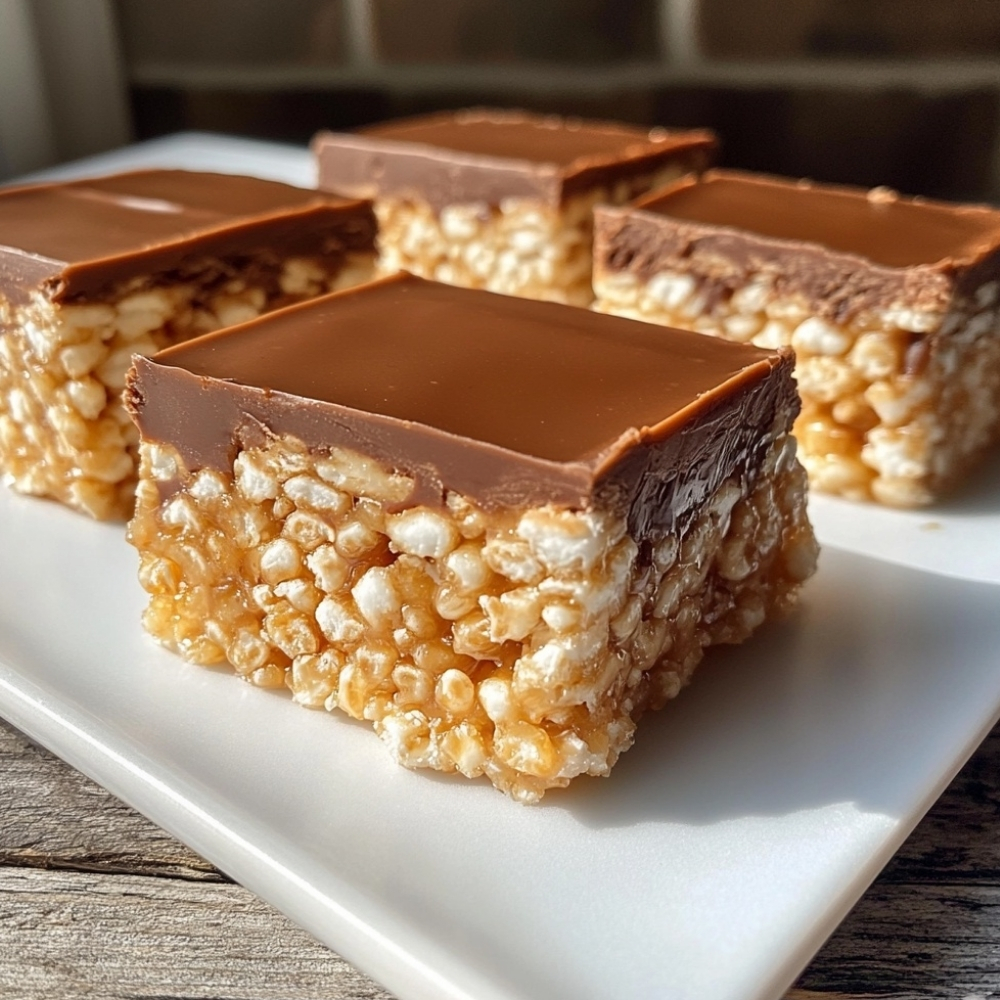 Buttery shortbread topped with a thick layer of soft caramel and finished with a crunchy chocolate Rice Krispy topping. These millionaire-style bars are rich, chewy, and perfectly crispy on top — ideal for parties, holidays, and gifting.